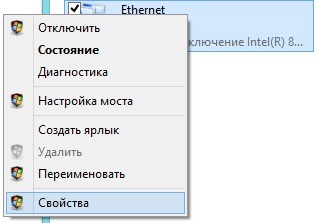 7. Нажав правой кнопкой мыши на используемом "сетевое подключении", выбрать пункт "Свойства"/"Properties"