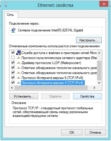 8. В "Свойствах", во вкладке "Общие" в разделе "Компоненты" выбрать пункт "Протокол Интернета(TCP/IP)", затем нажать "Свойства"