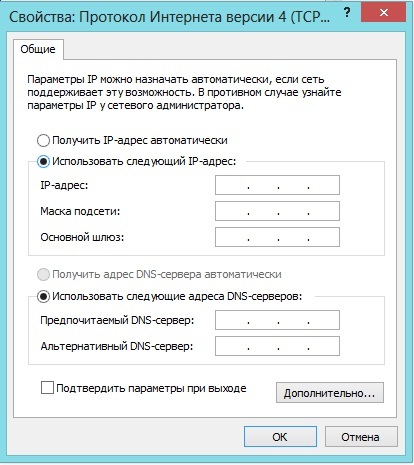 9. В окне "Свойства: протокол интернета (TCP/IP)", необходимо выбрать пункты "Использовать следующий IP-адрес" и заполнить все 5 строчек: IP-Адрес; Маска подсети; Основной Шлюз; Предпочитаемый DNS-сервер; Альтернативный DNS-сервер;