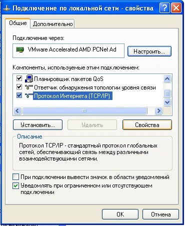 5. В "свойствах", во вкладке "Общие" в разделе "Компоненты" выбрать пункт "Протокол Интернета(TCP/IP)", затем нажать "Свойства"